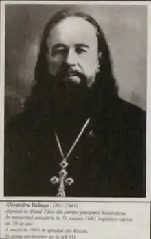 Alexandru Baltagă (April 14, 1861 – August 7, 1941) was a Bessarabian Romanian Orthodox priest, a founder of the Bessarabian religious press in the Romanian language, a member of Sfatul Țării (1917–1918), a Soviet political prisoner, and, according to the Orthodox Church, a martyr for the faith.