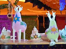 The different regions make their alfeñique figures according to local traditions and ingredients. Many families have been involved in making figurines for generations and some use molds that go back just as far. Apart from their popularity during Day of the Dead celebrations, many families display the objects, particularly the skulls, in their homes.[4] In Oaxaca, they commonly take the shape of skulls, crowns, crucifixes, the dead and are made from crystallized sugar with honey in the center. In the State of Mexico, the most common objects are coffins, hearses, deer, sheep, angels, fruit, and skulls made of white sugar paste.[4] In Puebla, the most common objects are skulls and coffins and the main ingredients include almonds, peanuts and pumpkin seeds mixed with sugar and egg, in the style of an almond paste.[5]