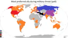 According to a 2017 poll by WIN/GIA, the United States was the most preferred ally internationally. Russia and China, who preferred one another, both trailed America globally. Four countries, Bulgaria, Greece, Slovenia and Turkey, preferred Russia, despite being members of NATO.[18]