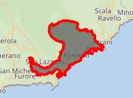 Amalfi (UK: /əˈmælfi/,[3][4] US: /ɑːˈmɑːlfi/,[5] Italian: [aˈmalfi]) is a town and comune in the province of Salerno, in the region of Campania, Italy, on the Gulf of Salerno. It lies at the mouth of a deep ravine, at the foot of Monte Cerreto (1,315 metres, 4,314 feet), surrounded by dramatic cliffs and coastal scenery. The town of Amalfi was the capital of the maritime republic known as the Duchy of Amalfi, an important trading power in the Mediterranean between 839 and around 1200.