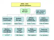Local and regional operational activities of the American Radio Relay League are carried out through its Field Organization. The organization divides the 15 Divisions into 71 separate geographic regions called Sections. Each Section has a similar team of one elected, volunteer Section Manager and several volunteer positions. Section Managers are elected by the members living within the section for a two-year term. The Section Manager appoints a team of volunteers. A Section Manager may optionally appoint one or more Assistant Section Managers.[7]