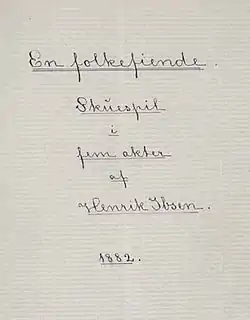 An Enemy of the People (original Norwegian title: En folkefiende) is an 1882 play by Norwegian playwright Henrik Ibsen. Ibsen wrote it in response to the public outcry against his previous play, Ghosts, which challenged the hypocrisy of 19th-century morality. According to Ellen Mortensen (Ibsen Studies v.7, 169), the words "scandalous", "degenerate," and "immoral" were hurled at both Ghosts and its author because it openly discussed adultery and syphilis. Therefore, An Enemy of the People tells the story of a man who dares to speak an unpalatable truth, and is punished for it. However, Ibsen took a somewhat skeptical view of his protagonist, suggesting that he may have gone too far in his zeal to tell the truth. Ibsen wrote to his publisher: "I am still uncertain as to whether I should call [An Enemy of the People] a comedy or a straight drama. It may [have] many traits of comedy, but it also is based on a serious idea."
