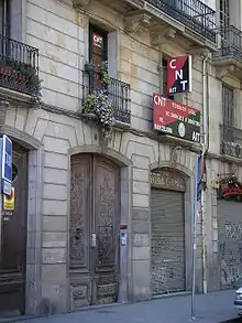 In 1910, the Confederación Nacional del Trabajo (CNT) was founded in the middle of the restoration in Barcelona in a congress of the Catalan trade union Solidaridad Obrera (Workers' Solidarity) with the objective of constituting an opposing force to the then-majority trade union, the socialist Unión General de Trabajadores (UGT) and "to speed up the economic emancipation of the working class through the revolutionary expropriation of the bourgeoisie". The CNT started small, counting 26,571 members represented through several trade unions and other confederations.[6] In 1911, coinciding with its first congress, the CNT initiated a general strike that provoked a Barcelona judge to declare the union illegal until 1914. Also in 1911, the trade union adopted its name formally.[6] From 1918 on, the CNT grew stronger and had an outstanding role in the events of the La Canadiense general strike, which paralyzed 70% of industry in Catalonia in 1919, the year the CNT reached a membership of 700,000.[7] Around that time, panic spread among employers, giving rise to the practice of pistolerismo (employing thugs to intimidate active unionists), causing a spiral of violence that significantly affected the trade union. These pistoleros are credited with killing 21 union leaders in 48 hours.[8]