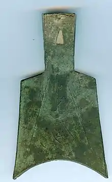 Sloping shoulder money - Pointed shoulder spades: This type of spade has pointed shoulders and feet, and a long hollow handle. There are three parallel lines on the obverse and reverse, and occasionally inscriptions. They are found in northeastern Henan and in Shanxi, territory of the Duchy of Jin, later to become Zhao. They are held to be somewhat later in date than the square shouldered spades. Their shape seems to be designed for ease of tying together in bundles, rather than developed from any particular agricultural instrument.[1]:17