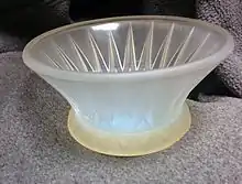 Hunebelle pieces are marked in several ways. The most common is A.HUNEBELLE-FRANCE in molded capitals either within the glass design or on the base. Other pieces are marked simply A.HUNEBELLE. There was also a paper label with A and H superimposed in a stylized manner. Since paper labels are frequently lost, many pieces may appear completely unmarked. In the author's collection there are pieces marked A.HUNEBELLE both with and without the word FRANCE, and a bowl marked MADE IN FRANCE that is identical to one shown in a Hunebelle catalogue. Hunebelle also used a more elaborate maker's mark imprinted on some glass pieces which had the word FRANCE encircled by the words MADE IN FRANCE MODELLE DEPOSE et R COGNEVILLE and with A. HUNEBELLE underneath (reflects mid 1930s partnership with COGNEVILLE).