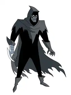 Described by Timm as resembling a "tall, gaunt Death character",[6] the Phantasm's costume is hooded and features a metal, skull-like mask. The Phantasm carries a large blade, reminiscent of a scythe, in her right hand. The blade was not part of Timm's original design, and was added later at Burnett's insistence.[2] The character's left glove houses a chemically-based, artificial fog-generating device that the Phantasm uses for stealth, combat, and intimidation. At various points in Mask of the Phantasm, the Phantasm's manipulation of fog makes it appear that the character has supernatural powers, such as intangibility and the ability to vanish. These smoke-filled appearances were influenced by the Marvel Comics supervillain Mysterio.[8]