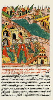Andreas left Rome to travel to Moscow once more in 1490, accompanied by Moscow's ambassadors to Rome, Greek brothers Demetrius and Manuel Rhalles. For unknown reasons, Andreas appears to have not been welcome in Moscow, and he instead chose to travel to France, where he was generously received by King Charles VIII, who paid for all of his travel expenses after Andreas gifted him a white falcon.[41] Andreas stayed with the king at Laval and Tours from October to December 1491 and received additional money, amounting to 350 livres, before he returned to Rome.[42][43] According to chronicler Gherardi da Volterra, Andreas and Charles spent much time discussing the possibility of a crusade against the Ottomans.[44] In 1492, Andreas was in England, where King Henry VII was not as hospitable as Charles VIII, instructing his treasurer, Lord Dynham, to pay Andreas with an amount he thought appropriate and then give him safe passage out of the country. Andreas's European tour in search for aid for his cause was similar to the one conducted by his grandfather, Emperor Manuel II Palaiologos, who traveled Europe from 1399 to 1402 in the hope of securing aid against the Ottomans.[45]