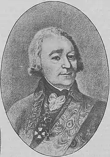 Alexander Suvorov, Semyon Petrovich Ozerov (1725-1807) and Miloradovich stood out as heroes of the Battle of Kozludzha in 1773; the defeat of the Turks was complete.[5] As a reward for his brave actions in the war of 1771-1774, Miloradovich received the Order of St. George, 3rd degree (No. 44) on 10 July 1775. In addition, he was given the Voronki village in the Gorodishchensky centesimal Lubensky regiment.[6] In 1779, Miloradovich was promoted to lieutenant general and soon was appointed the governor of the newly-established Chernigov Governorate, which he ruled for more than fifteen years, but the governorship existed for a relatively short time and was replaced by the establishment of Little Russia. In 1786 he was awarded the Order of Saint Vladimir, 2nd degree and the Order of Saint Alexander Nevsky.