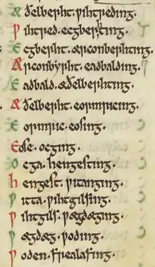 The ruling dynasty of East Anglia, the Wuffingas, were named for Wuffa, son of Wehha, who is made the ancestor of the historical Wuffingas dynasty, and given a pedigree from Woden.[22] Wehha appears as Ƿehh Ƿilhelming (Wehha Wilhelming - son of Wilhelm) in the Anglian Collection.[23] According to the 9th-century History of the Britons, his father Guillem Guercha (the Wilhelm of the Anglian Collection pedigree) was the first king of the East Angles,[24] but D. P. Kirby is among those historians who have concluded that Wehha was the founder of the Wuffingas line.[25] From Wilhelm the pedigree is continued back through Hryþ, Hroðmund (a name otherwise only known from Beowulf), Trygil, Tyttman, Caser (Latin Caesar, i.e. Julius Caesar) to Woden. The placement of Caesar within this pedigree perhaps defers to early traditions deriving Woden from 'Greekland'.[26] The Anglo-Saxon Chronicle gives no pedigree for this dynasty.
