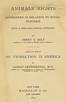 Animals' Rights: Considered in Relation to Social Progress is an 1892 book by the English social reformer Henry Stephens Salt.[1] It is widely considered to be the first explicit treatment of the concept of animal rights.[2]