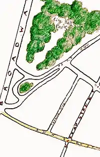 Ann Street is one of the oldest streets in New York City, appearing on a map created in 1728. Ann Street was named after Ann White, the wife of a developer and merchant, Capt. Thomas White. She may have urged him to name the street after her because other merchants' wives already had streets named after them.[1] The street is relatively small and short compared with the other lower Manhattan streets named after merchants' wives. There have been several other streets in the city named Ann Street. One laid out between Reade and Franklin Streets prior to 1797 later became Elm Street. "Anne Street" was also a name circa 1748 for part of the present William Street. Today, there is only one Ann Street in Manhattan.