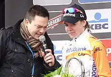 Van der Breggen's first season on the Rabo team proved highly fruitful. She opened the year with top-10 finishes in the Ronde van Drenthe,[22] Trofeo Alfredo Binda,[23] and the Tour of Flanders,[24] and started showing her stage racing potential throughout the season. She claimed notable wins in the overall classification of both the Ladies Tour of Norway and Grand Prix Elsy Jacobs in Luxembourg;[25] as well as a runner-up spot in the Belgium Tour and third places in the Emakumeen Euskal Bira and the Giro Rosa, in a podium made up entirely of Rabo–Liv riders.[26]