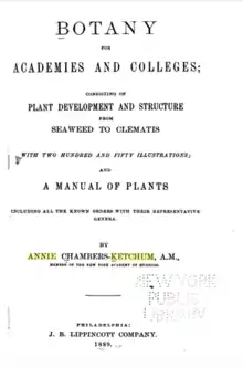 Upon her return to the U.S., she fixed upon New York City as a place of residence, writing for journals and building up over 100 lectures on literature, science and art.[8] It was during this time that she published her novel with Lippincott, and her textbook Botany for academies and colleges: consisting of plant development and structure from seaweed to clematis, which included illustrations she had made during her visits to European gardens. In Will Hale's 1903 summary of Southern periodicals, he described his great respect for her as a scientist and writer, describing her through the eyes of a woman of his acquaintance: "In 1887 a Philadelphia house brought out Mrs. Chambers-Ketchum's Botany for Academies and Colleges. During the preparation of that work, I had the honor of entertaining her as a guest in my home. A lady once gave this account of her: 'She has a handsome forehead; mouth large; large black eyes, beautiful more with brilliancy than softness. She is a brilliant talker. ... She is a glorious woman, and a poetess.'"[9]