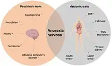 A 2019 study found a genetic relationship with mental disorders, such as schizophrenia, obsessive–compulsive disorder, anxiety disorder and depression; and metabolic functioning with a negative correlation with fat mass, type 2 diabetes and leptin.[56]