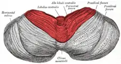 ![]() Superior view of an cerebellum. Anterior lobe shown in red. | |