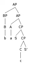 In this tree, the set of pairs of nonterminal categories such that the first member of the pair asymmetrically c-commands the second member is as follows: {⟨BP, A⟩, ⟨BP, CP⟩, ⟨A, CP⟩}. This gives rise to the total ordering: ⟨b, a, c⟩.