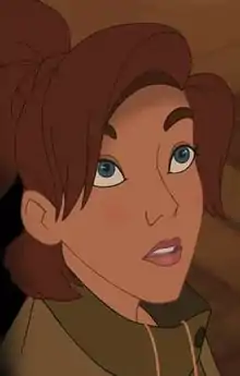 Anya has a slender frame and slightly tanned skin, along with long flowing auburn hair and blue eyes. Unlike most animated heroines, she wears many outfits throughout the movie. She starts off the movie clad in a ragged yellow tunic and black tights under a green overcoat. Once she is en route to Paris, however, she wears a short-sleeved blue dress given to her by Dimitri. After showcasing a series of flapper-inspired outfits, Anya wears a strapless navy blue evening dress with her hair up. At the end, when Anya is now known to be the Princess Anastasia, she wears an elaborate gold court dress, complete with a glittering diamond kokoshnik.