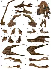 An additional four possible autapomorphies were identified in the referred specimens. The main body of the maxilla has no depression around the antorbital fenestra. The nasal branch of the maxilla is elongated and constructed like an inverted L. The branch of the jugal towards the quadratojugal is vertically deep. The same branch is forked at its rear end.[3]