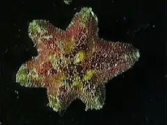 It is a very small starfish, less than 2 cm (0.79 in), with seven or eight short, rounded arms, often irregular in length. This is due to its potential of regeneration, but also to its ability to reproduce through fissiparity.[1] The arms measure 5 mm (0.20 in) in length, and the starfish has multiple madreporites and a single spine on the interradial plates. Solitary papules are present on the top of the starfish. Spikes are present and are rough, granular, and crystalline, and are conical and prominent on the arms.[2] It has an irregular pattern of colours, showing a grey-beige background with granular patterns of reddish or greenish.[2]