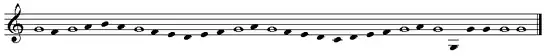 The tonal levels, or axial pitches, begin in the lower register and gradually rise to the highest at the climax before descending again, for example (in European-influenced notation):[5]