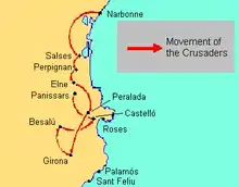Peter's eldest son, the future Alfonso III, was placed in charge of defending the border with Navarre, which was ruled by Philip III's son, Philip the Fair. Although Peter feared a full-scale invasion from Navarre, there were only some cross-border raids. The Navarrese king joined the main invading army under his father.[1]