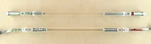 In popular use, the term arc lamp means carbon arc lamp only. In a carbon arc lamp, the electrodes are carbon rods in free air. To ignite the lamp, the rods are touched together, thus allowing a relatively low voltage to strike the arc.[1] The rods are then slowly drawn apart, and electric current heats and maintains an arc across the gap. The tips of the carbon rods are heated and the carbon vaporizes. The carbon vapor in the arc is highly luminous, which is what produces the bright light.[1] The rods are slowly burnt away in use, and the distance between them needs to be regularly adjusted in order to maintain the arc.[1]