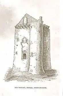 The distribution of tower houses in Wales has been discussed by both Hilling and Smith. Welsh tower houses, most of them built between the early 14th and 15th centuries, were rectangular structures, consisting of two or more storeys, and are closely related to those in Ireland and Scotland. In 1976 Hilling produced a map (with listing) showing 17 examples.[4] Further houses have been added by Suggett and it is possible that new examples will be recognised as being incorporated into existing buildings, as at Sandyhaven House in Pembrokeshire.[5]