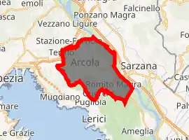 Arcola (Ligurian: Arcoa[3]) is a comune (municipality) in the Province of La Spezia in the Italian region Liguria, located about 80 kilometres (50 mi) southeast of Genoa and about 7 kilometres (4 mi) northeast of La Spezia. As of 31 December 2004, it had a population of 10,145 and an area of 16.4 square kilometres (6.3 sq mi).[4]