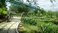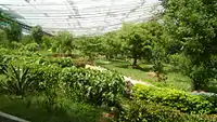 The zoo is located within the Vandalur Reserve Forest area.[23] The zoo's ecosystem consists of dry deciduous and dry evergreen scrub forest vegetation of the Eastern Ghats, a degraded forest consisting of mostly thorny bushes, receiving an average annual rainfall of 1,400 millimetres (55 in) and an average annual temperature of 26 °C (79 °F).[24] The terrain is a gentle undulating one[20] ranging in altitude from 10 to 100 metres (33 to 328 ft) with an average elevation of 50 metres (160 ft) above sea level.[24] The park was designed to keep the natural vegetation of the area intact except where enclosures, roads, and structures had to be constructed. Originally a sparse scrub forest invaded by weeds, consisting of species such as Carissa sp., Gmelina sp., Eugenia sp., Acacia sp., Instia sp. and a few other dry evergreen forest species, the park's vegetation was gradually enriched by planting dry evergreen species.[24] The entire campus has been fortified by means of a compound wall,[25] preventing any biotic interference in the park and allowing the natural growth of vegetation, which give the park the look of a natural forest. The park is built based on the 'open zoo' concept. The exhibits were originally based on taxonomic and geographical distribution of the species, but have now been replaced by ecological niches and habitats. The order of priority is local species, followed by regional, national, and international species. The use of moats has made it possible to house predator and prey in extended enclosures that provide a panorama of wildlife. There are over 75 moated enclosures in the park. Enrichments in the form of ladders, climbing materials, etc. are provided for the animals to move around the enclosure freely.[26]