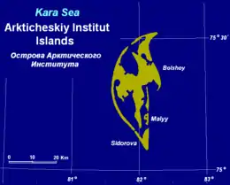 ![]() Location of the Arkticheskiy Institut Islands in the Kara Sea. | |