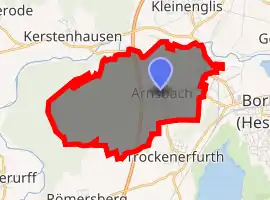 Arnsbach is a village in the Schwalm-Eder-Kreis, northern Hesse, Germany. It became a district of Borken in 1974. It has 482 inhabitants (February 2020).[1] It lies near the Stockelache bathing lake. On the northeastern foot of the Altenburg (castle) lies the early settlement of Blankenhain. The village is first mentioned in documents in 1245 as Arnesbach. The district of Arnsbach is located in the west of the Borken basin and has a size of approximately 688 hectares. The bathing lake of Stockelache was created from a lignite mine in the area. Southeast, on the summit of the mountain Altenburg and partly on Arnsbacher district, are the remains of an Iron Age circular wall called Altenburg, or Altenburg at Römersberg.