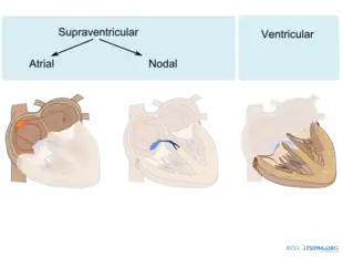 There are four main groups of arrhythmia: extra beats, supraventricular tachycardias, ventricular arrhythmias and bradyarrhythmias.[3] Extra beats include premature atrial contractions, premature ventricular contractions and premature junctional contractions.[3] Supraventricular tachycardias include atrial fibrillation, atrial flutter and paroxysmal supraventricular tachycardia.[3] Ventricular arrhythmias include ventricular fibrillation and ventricular tachycardia.[3][7] Arrhythmias are due to problems with the electrical conduction system of the heart.[2] Arrhythmias may also occur in children; however, the normal range for the heart rate is different and depends on age.[3] A number of tests can help with diagnosis, including an electrocardiogram (ECG) and Holter monitor.[5]