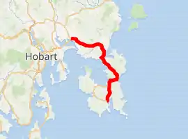 From its intersection with the Tasman Highway in Sorell the highway runs east, crossing Iron Creek before turning south-east to Forcett. From there it continues in an easterly direction, crossing the Carlton River, to Copping, where it turns south to Dunalley. Here it crosses the Denison Canal via a swing bridge to the Forestier Peninsula, before continuing south-east to Eaglehawk Neck, the entry to the Tasman Peninsula. After following the southern shore of Eaglehawk Bay to the west the highway turns south and continues in that direction to Port Arthur where it transitions to route B37 (Nubeena Road).[4]