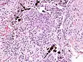 The black arrows point to ferrugionous bodies that are located at the periphery of a focus of non-small cell lung carcinoma, NOS.