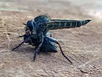 After hatching, robber fly larvae generally seem to live in soil, rotting wood, leaf mold and similar materials, some being predatory and others detrivorous.[5] Larvae are also predacious, feeding on eggs, larvae, or other soft-bodied insects. Robber flies overwinter as larvae and pupate in the soil. Pupae migrate to the soil surface and emerge as adults, often leaving behind their pupal casing. Complete development ranges from one to three years, depending on species and environmental conditions.[6]