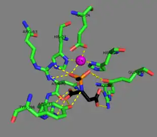 The zinc cofactor is found at the active site and is held by Glu-24, His-21, and His 116.[12] The substrate is held in place by Arg-63, Asn-70, Arg-71, Tyr-164, Arg-168, and Tyr-288.[5] The zinc cofactor is used to lower the pKa of a ligated water so that an attack on N-acetyl-L-aspartate may occur and to stabilize the resulting tetrahedral intermediate along with Arg-63, and Glu-178.[12]