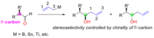 Addition of achiral allylmetals to aldehydes forms a chiral alcohol, the stereochemical outcome of this reaction is determined by the chirality of the α-carbon on the aldehyde substrate (Figure "Substrate control: addition of achiral allylmetals to α-chiral aldehydes"). The allylmetal reagents used include boron, tin and titanium.