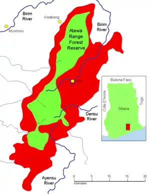 A large area of the range has been declared a forest reserve, including about 17,400 hectares of upland evergreen forest, rare for Ghana. The reserve is managed by the Forestry Commission of Ghana in collaboration with other stakeholders, key among them is the Okyeman Environment Foundation, which has restricted people from farming in the area and instead is trying to encourage eco-tourism.[1] However, the reserve is under pressure from logging and hunting for bushmeat. It is also vulnerable to mining exploration activities, since the reserve contains gold deposits as well as low-grade bauxite.[2]