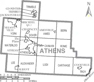 Athens County is a county in southeastern Ohio. As of the 2010 census, the population was 64,757.[2] Its county seat is Athens.[3] The county was formed in 1805 from Washington County. Because the original state university (Ohio University) was founded there in 1804, the town and the county were named for the ancient center of learning, Athens, Greece.[4]