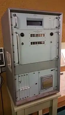 With the display unit mounted in a 3-foot-high (0.91 m) steel cabinet, the system used two sets of five photo-sensitive cells within the detection head to record the intense flash of light produced by the detonation of the weapon followed, within a second, by a second intense flash. This double flash is characteristic of a nuclear explosion and measurement of the short gap between the two flashes enabled the weapon's power to be estimated, and the bearing to be indicated. It had a range of 150 miles (240 km) in good visibility.[1][2] From 1974 AWDREY units were used together with a device known as DIADEM (Direction Indicator of Atomic Detonation by Electronic Means) which measured the electromagnetic pulse (EMP) generated by an explosion.[3] The instruments were in constant operation (state of readiness) between 1968 and 1992 and tested daily by full-time ROC officers.