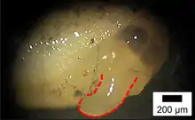| Atopos slug attacking Plectostoma concinnum by shell-drilling. | |