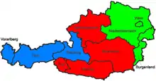 The Austrian Regionalliga (German: Regionalliga or plural Regionalligen, means Regional League) is the third-highest division in Austrian football, after the Austrian Bundesliga and the Second League. It is divided into three groups: East (Ost), covering the states of Vienna, Lower Austria and Burgenland; Central (Mitte), covering the states of Styria, Carinthia, Upper Austria and the exclave of East Tyrol; and Eliteliga West, covering the states of Salzburg, Tyrol (with the exception of East Tyrol) and Vorarlberg.