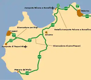 The Autostrada A29 is a 114.8 km (71.3 mi) motorway on the island of Sicily that links Palermo to Mazara del Vallo. The motorway is also called Autostrada del Sale (Motorway of Salt) because one of its branches ends at the Salt Pans between Marsala and Trapani. It's a four-lane motorway in its whole length.