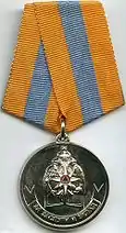 Awarded to the most distinguished members of the staff of the Ministry of Emergency Situations of Russia, and in some cases, to other citizens for courage and dedication in conditions involving the risk of life, for skilful and decisive actions and initiative contributing to the successful implementation of measures to eliminate the consequences of emergencies, save lives and protect property; for the successful management of the actions of subordinates in carrying out tasks in the aftermath of an emergency. A 3,000 rouble monetary reward accompanies the medal.[2][5][3][4] |