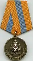 Awarded to personnel of the Ministry of Emergency Situations of Russia, and to other citizens, for merit in strengthening the community of rescue services, for long-term and fruitful work in the field of civil defense, in the protection of populations and territories from emergency situations, from natural and man-made disasters, for ensuring fire prevention and water safety, for providing substantial assistance in the implementation of the goals and objectives of the Ministry of Emergency Situations of Russia.[2][3][9] |