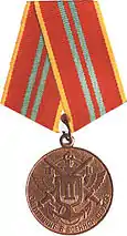 Awarded to military members of civil defense forces with at least 2 years experience in the service, who have achieved high performance in combat training, improved their professional qualifications, for courage, resourcefulness and initiative in the line of duty, and displayed military discipline.[3][27] |