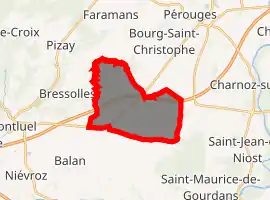 It lies about 30 km northeast of Lyon. The commune includes part of the village of La Valbonne at the foot of the hill (the rest belongs to the neighboring commune of Balan) and the hamlet of Chânes.