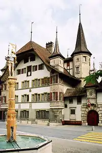The castle was built in 1621-24 as the residence of the Bernese Landvogt over the area. It was built on the site of four farm houses. Between 1624 and the 1798 French invasion a total of 77 Landvogts lived in the castle. Some of the bullet scars from the troops that invaded in 1798 are still visible on the castle walls. Today the castle is home to the municipal administration and government offices. In 2003 the 17th century murals and other art were restored to their original appearance.[2]