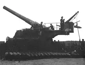 The custom-designed 35-calibres Mk XIII gun had a heavier breech which allowed the trunnions to be closer to the breech and hence the breech did not depress as far when the barrel was elevated. On a new Mk IV mounting, Mk XIII guns could then be elevated to 40° and attain a range of 22,600 yards.[4] These remained in service until 1945, serving in the home defence of Britain in World War II.