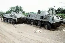 In 1992, the separatist state of Abkhazia declared Independence from Georgia and the War in Abkhazia (1992–1993) began. Georgia sent its troops to Abkhazia to stabilize the region. The 3,000-man force was poorly equipped with military vehicles, having only five T-55 main battle tanks, a few BMP-2 infantry fighting vehicles, three BTR-60/70 armoured personnel carriers and a small number of BM-21 Grad MRLs. As the war continued, the Georgian forces in Abkhazia were strengthened. The rebels had no AFVs of their own, but captured some heavy equipment from the Georgians.[20] BTR-60 was also used by Ossetian rebels during 1991–1992 South Ossetia War, in one case Ossetian rebels supported by BTR-60PB launched an attack on Georgian Checkpoint, BTR was heavily damaged by 30mm Rounds fired by Georgian BMP-2 and was forced to retreat, following BTR-60 was found by Georgian forces in several days after attack, it was repaired and used by Georgian National Guard.